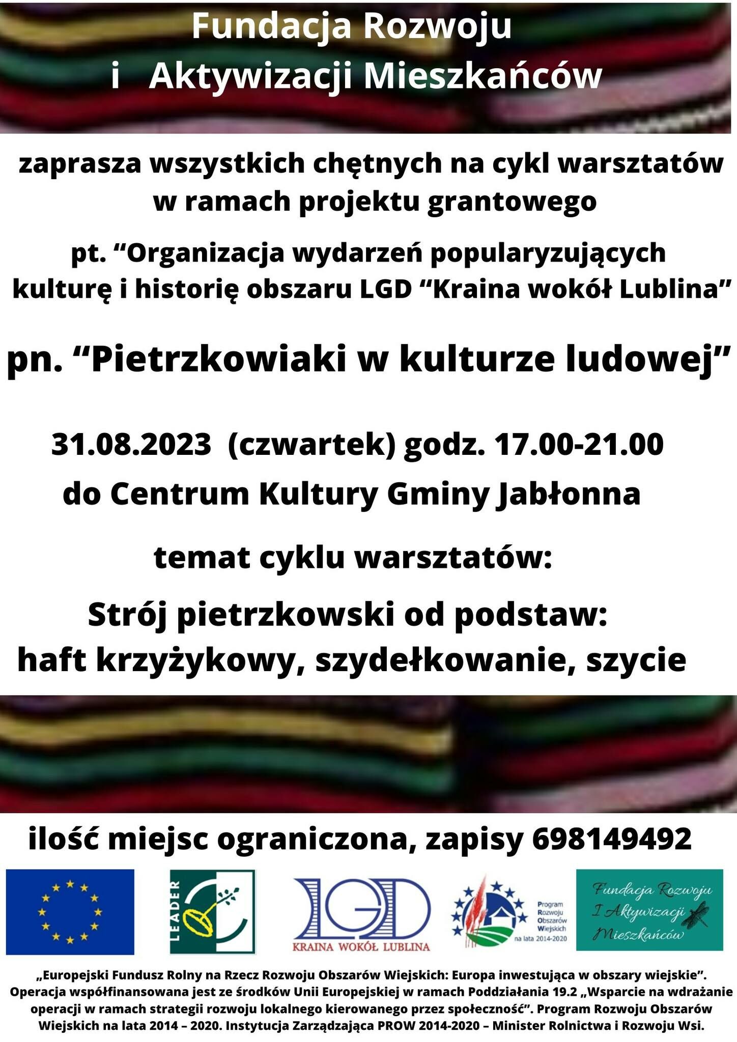temat cyklu warsztatów: Strój pietrzkowski od podstaw: haft krzyżykowy, szydełkowanie, szycie